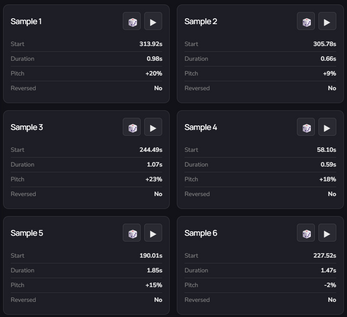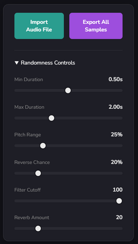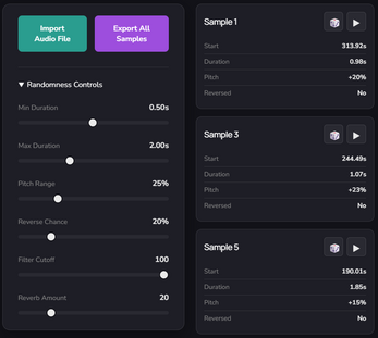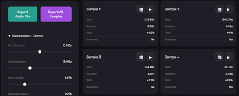 Upload a WAV, MP3, or AIFF file, and the app automatically slices it into eight randomized fragments. Each sample has its own start point, duration, pitch shift, and optional reversal. The built-in controls let you fine-tune the system’s randomness — shaping the results from chaotic glitch textures to subtle rhythmic cuts.