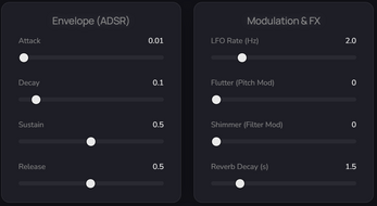 LFO modulation for pitch (Flutter) and filter sweeps (Shimmer).