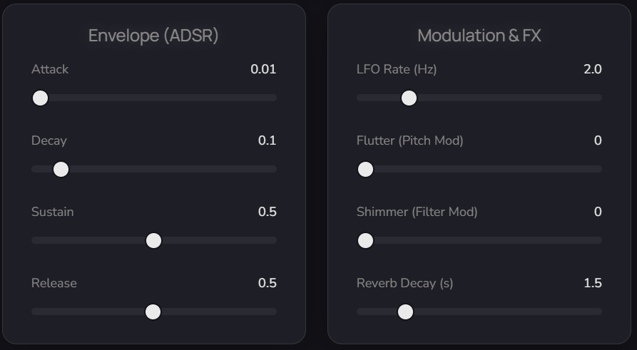 ADSR Envelope: Shape your sound’s attack, decay, sustain, and release for anything from sharp blips to lush drones.