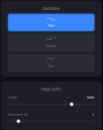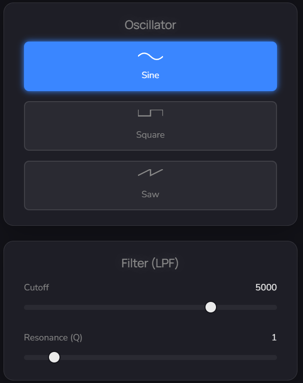 Real-Time Synthesis: Create evolving tones using sine, square, and saw oscillators.