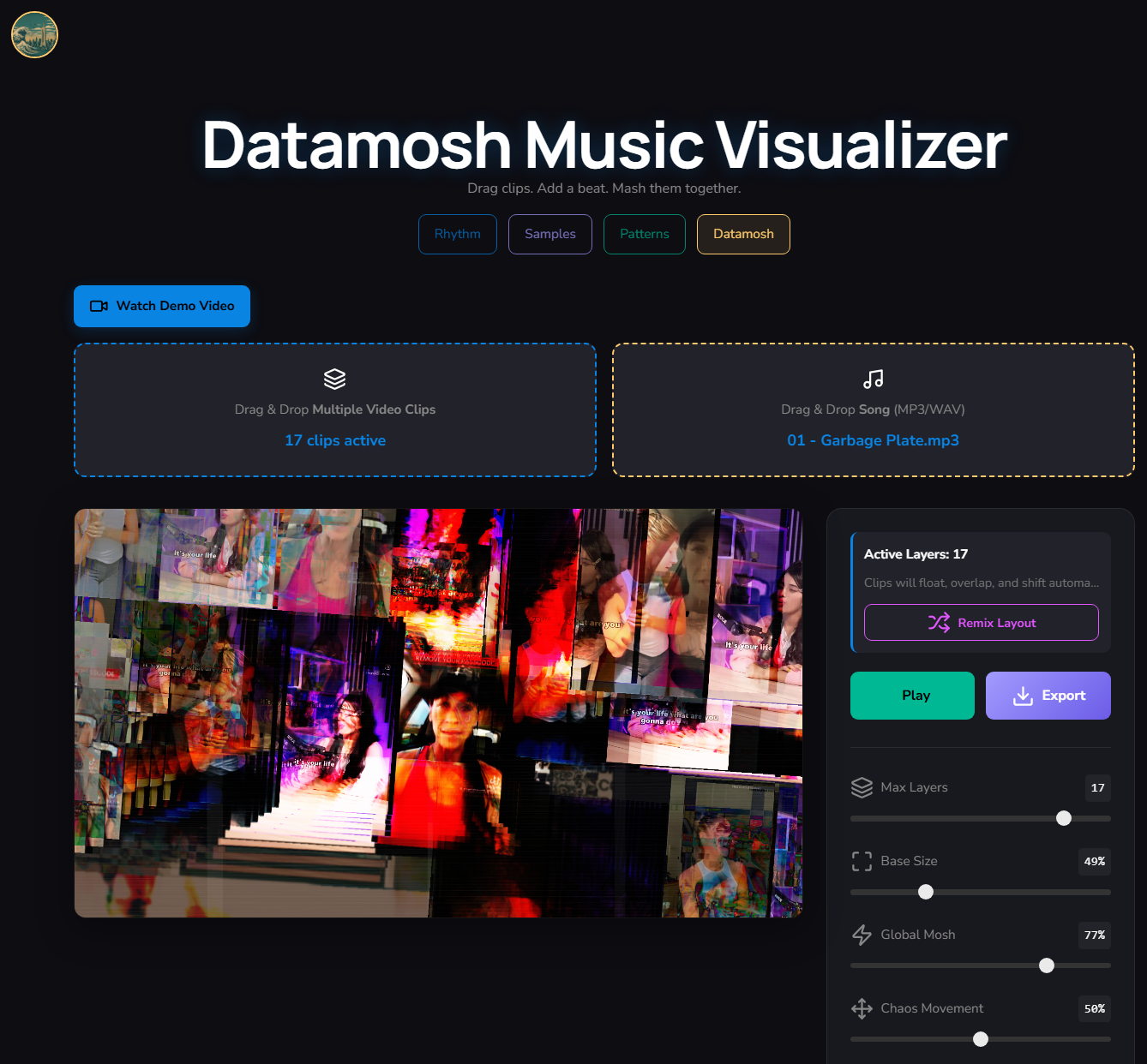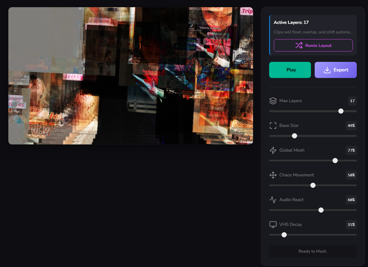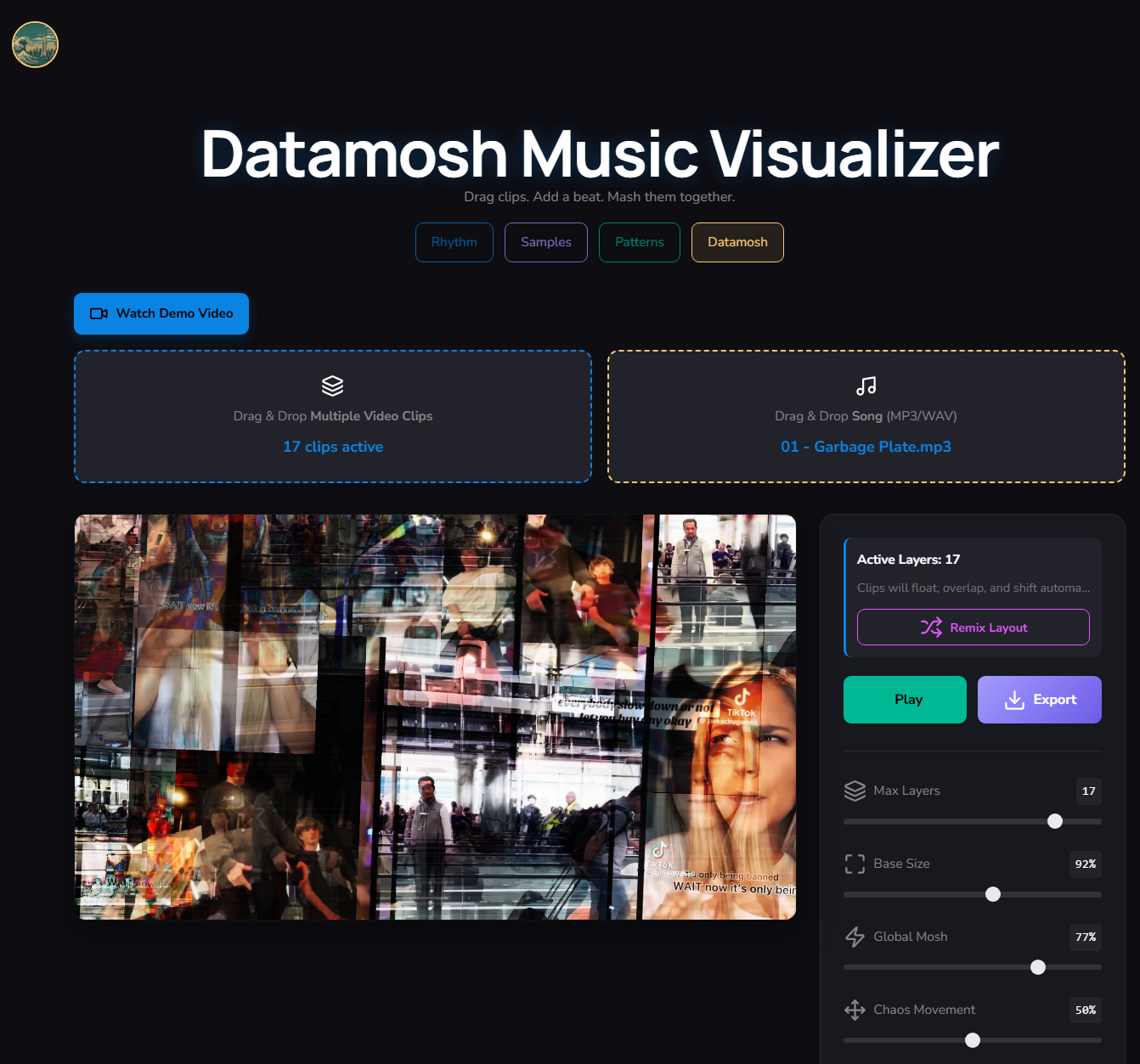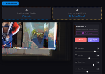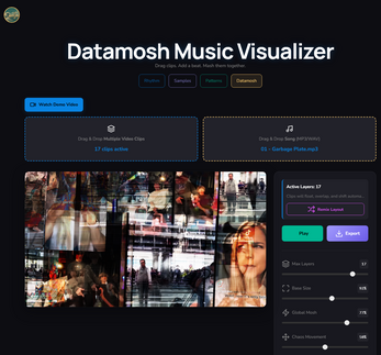 This is a browser-based datamosh-style music visualizer for creating chaotic, audio-reactive video collages—no timeline, no keyframes, no presets to memorize. Just throw in some video clips, drop in a song, and let controlled chaos do the rest.