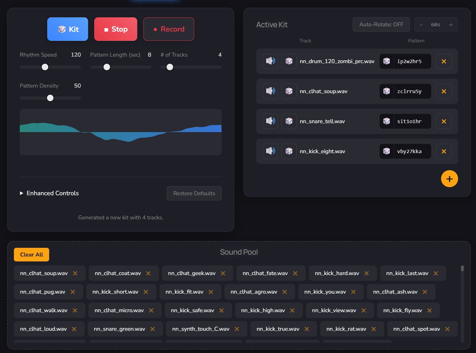 Once your sounds are loaded, let the app generate evolving rhythmic “kits” from random seeds. You can play, record, and layer your creations — or simply let it drift as an evolving sound toy with the "Auto-Rotate" option enabled.
