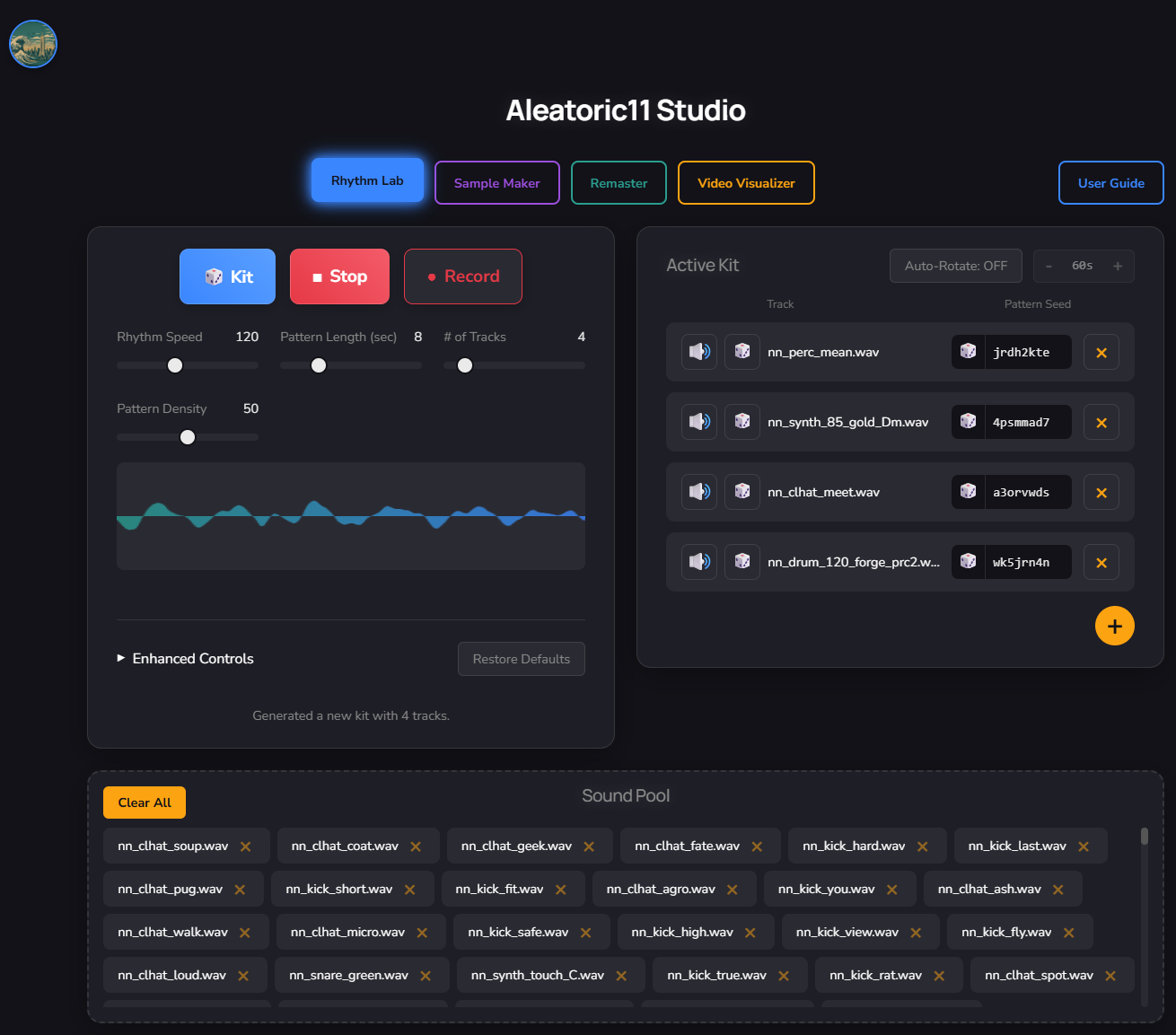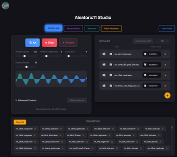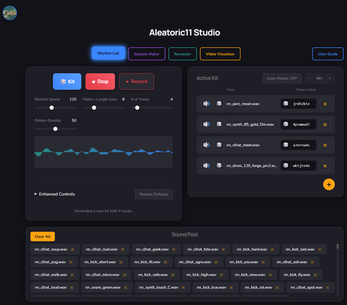 Aleatoric11 Rhythm Lab is a browser-based generative rhythm and sound tool — part drum machine, part sandbox, part creative experiment.